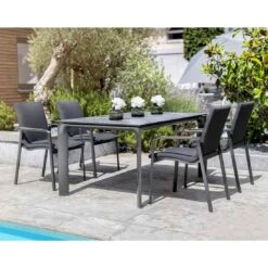 Für die Herstellung des Gestells wird hochwertiges und wetterfestes Aluminium verwendet. Für die Bespannung der Sitzfläche wird hochwertiges Textilene verwendet. Es zeichnet sich durch eine hohe Robustheit gegenüber Hitze und Frost aus und ist leicht zu reinigen. Für ein perfekt stimmiges Gesamtbild sorgt die einheitliche Farbgebung in stilvollem Anthrazit.