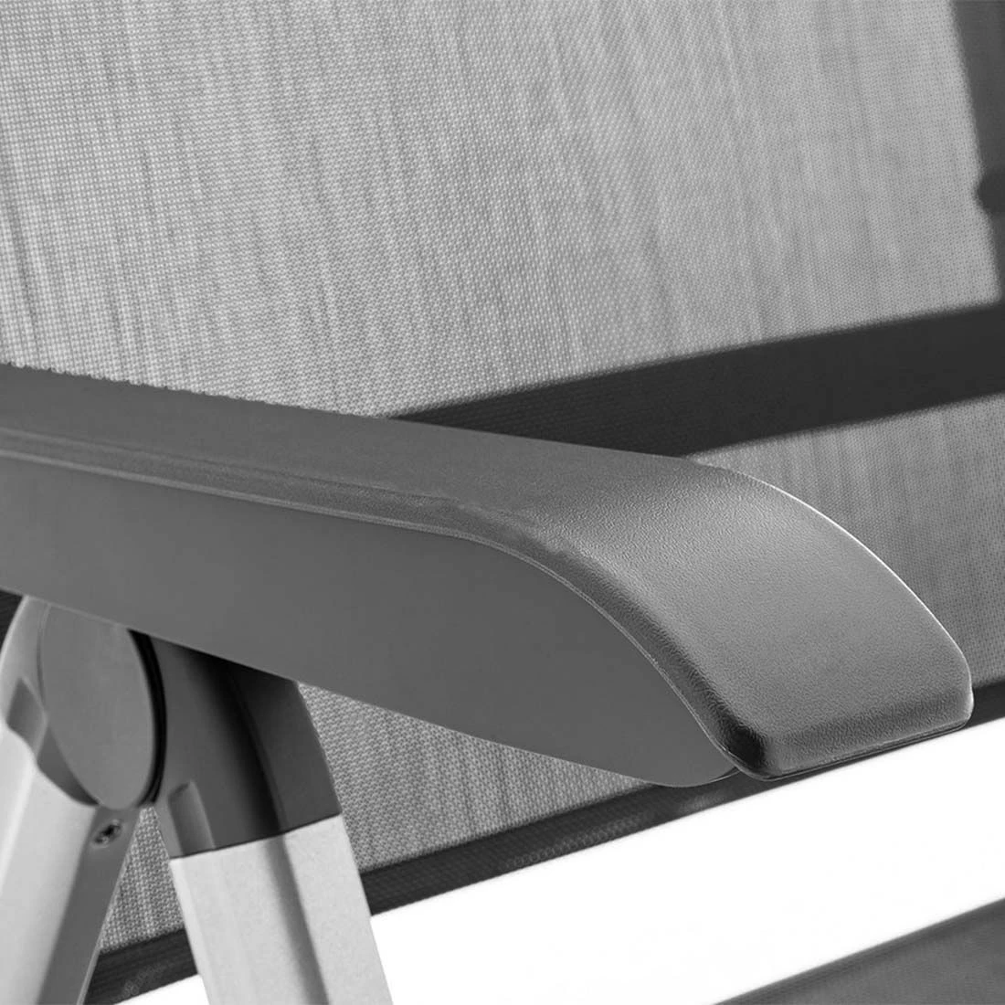 Das Gestell ist aus Aluminium gefertigt. Dadurch lassen sich die Möbel leicht von einem Standort zum nächsten transportieren und sind dennoch sehr stabil. Ein weiterer Pluspunkt der Sitzmöbel ist die Bespannung der Sitzflächen mit Textilene in der Farbe Anthrazit. Dieses Material zeichnet sich durch eine hohe Robustheit gegenüber Hitze und Frost aus und ist leicht zu reinigen.