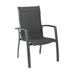 Das Gestell besteht aus pflegeleichtem und wetterfestem Aluminium. Farblich ist dieses in Anthrazit gehalten. Für die Bespannung der Sitzfläche verlässt sich der Hersteller auf hochwertiges Textilene. Es zeichnet sich durch eine hohe Robustheit gegenüber Hitze und Frost aus und ist leicht zu reinigen. Die Farbgestaltung der Sitzfläche in Anthrazit-Grau ist überaus ansprechend.