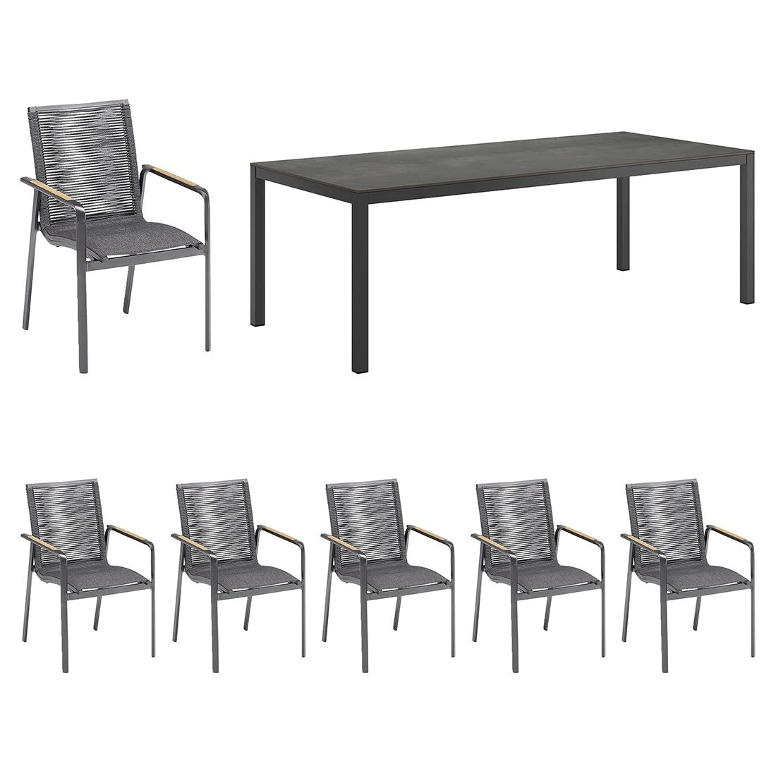 Im Set enthalten ist zudem ein Tisch. Die ansprechende HPL-Tischplatte ist nicht nur ein optischer Hingucker, sondern besitzt außerdem eine außerordentlich widerstandsfähige und absolut kratzfeste Oberfläche, die jeglichen Belastungen trotzt. Klassisch aus vier Tischbeinen besteht das Gestell des Tisches. Die rechteckige Form ermöglicht es Ihnen, den Tisch in Ecken und an Häuserwänden platzsparend einzusetzen.