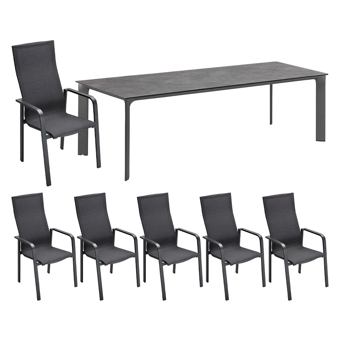 Das Gestell ist aus Aluminium gefertigt. Dadurch lassen sich die Möbel leicht von einem Standort zum nächsten transportieren und sind dennoch sehr stabil. Ein der Sitzmöbel ist die Bespannung der Sitzflächen mit Textilene. Dieses Material zeichnet sich durch eine hohe Robustheit gegenüber Hitze und Frost aus und ist leicht zu reinigen.