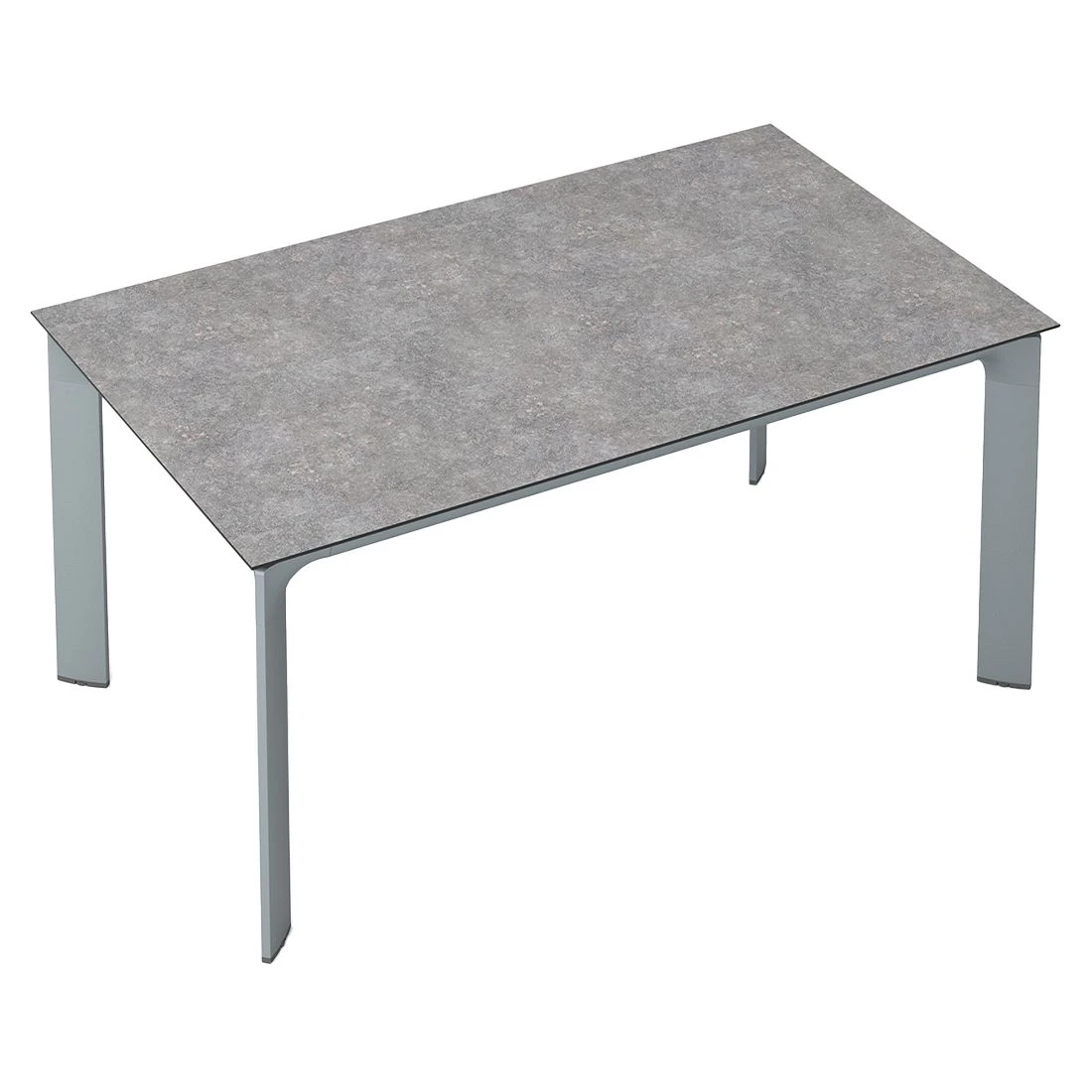 Das Gestell des eleganten Tisches ist aus Aluminium hergestellt. Klassisch aus vier Tischbeinen besteht das Gestell des Tisches. Die schöne HPL-Tischplatte ist nicht nur ein optischer Hingucker, sondern besitzt außerdem eine außergewöhnlich widerstandsfähige und durchaus kratzfeste Oberfläche, die unterschiedlichen Belastungen trotzt. Farblich ist die Platte in Kalksandstein gehalten. Der Gartentisch ist klassisch rechteckig gestaltet.