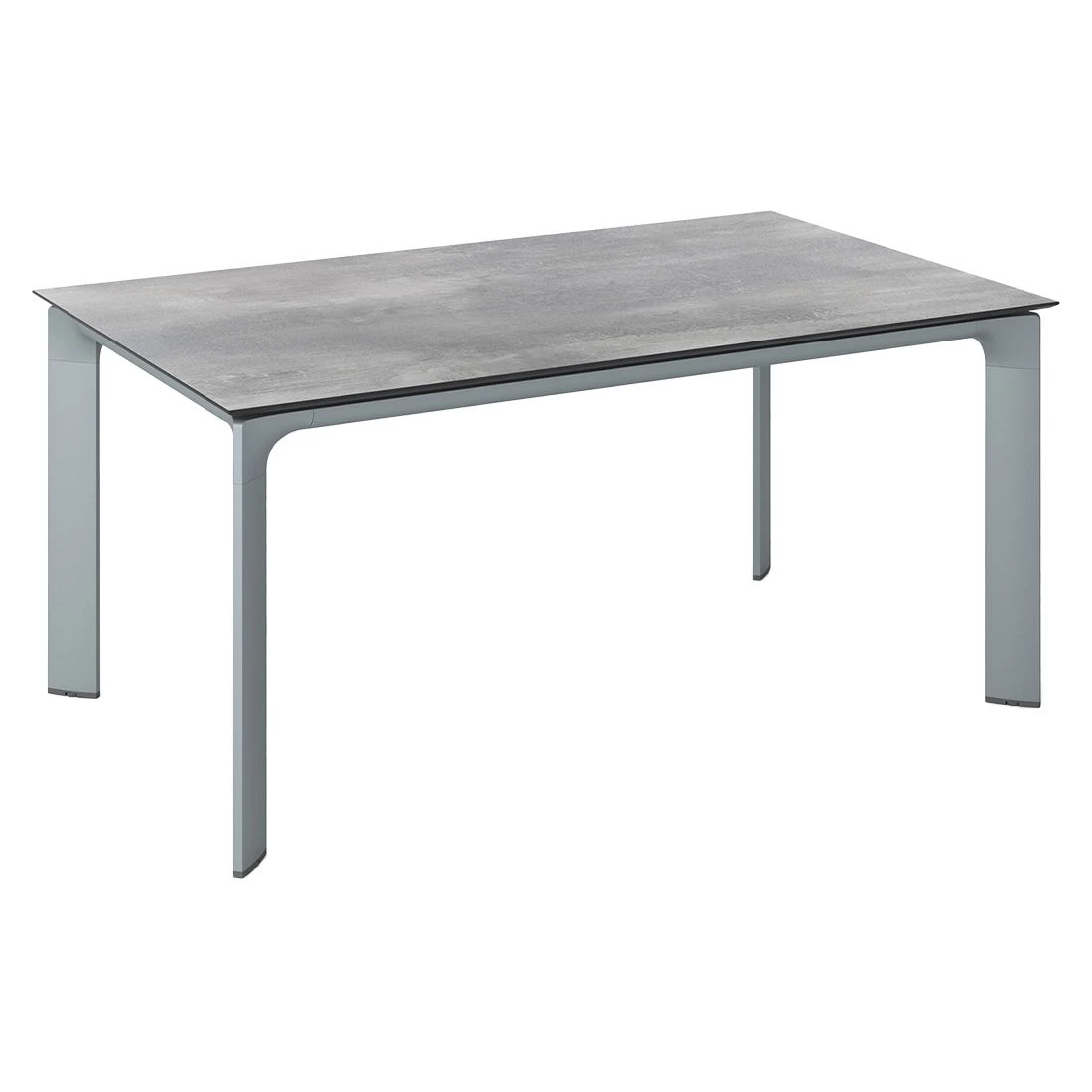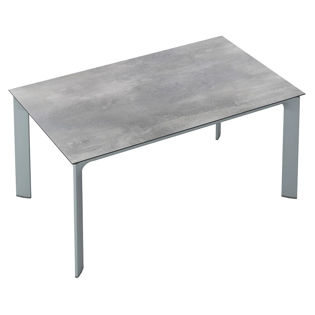 Das Gestell des eleganten Tisches besteht aus Aluminium. Das klassische Vierfuß-Gestell garantiert Ihnen maximale Beinfreiheit. Eine wunderbare Optik bietet Ihnen die Tischplatte aus HPL. Diese natürlich gehaltene Tischplatte ist zusätzlich beständig gegen Frost und Hitze bis maximal 180 °C. Farblich ist die Platte in Silbergrau gehalten. Mit der rechteckigen Form lässt sich der Gartentisch platzsparend in Ecken oder an Häuserwänden aufstellen.