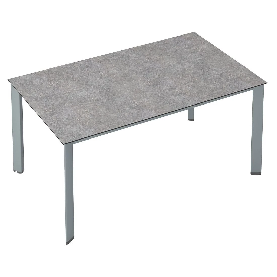 Das Gestell des attraktiven Tisches ist aus Aluminium hergestellt. Als klassische Design-Komponente fungiert das geradlinige Vierfußgestell. Eine wunderbare Optik bietet Ihnen die Tischplatte aus HPL-Kunststoffverbund. Diese im Naturdecor gehaltene Tischplatte ist dabei beständig gegen Frost und Hitze bis maximal 180 °C. Für ein elegantes Gesamtbild erscheint die Platte in der Farbe Kalksandstein. Der Gartentisch ist klassisch rechteckig gestaltet.