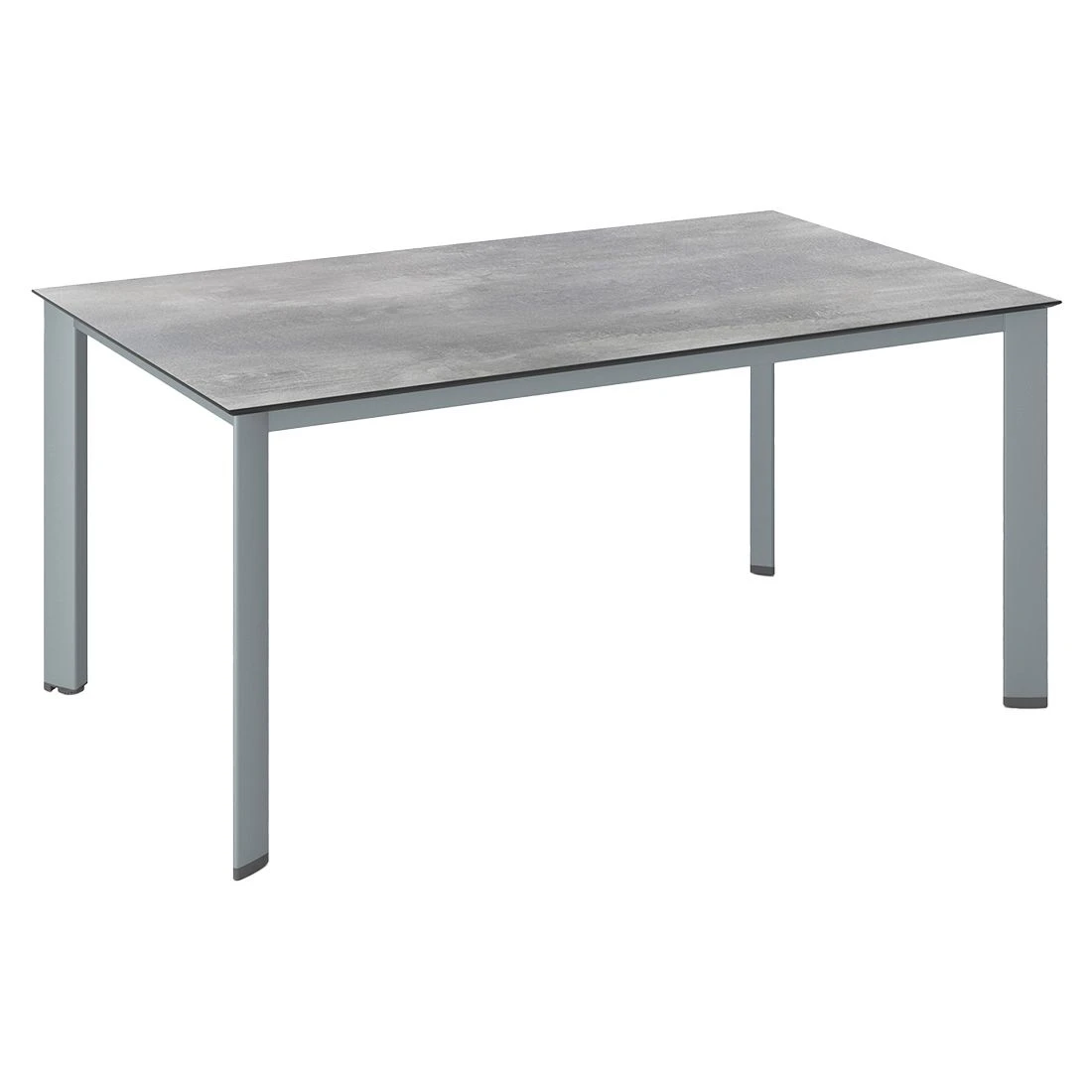 Als Gestellmaterial dient wertiges Aluminium. Als klassische Design-Komponente fungiert das geradlinige Vierfußgestell. Eine ausgesprochen schöne Optik bietet Ihnen die Tischplatte aus HPL-Kunststoffverbund. Diese natürlich gehaltene Tischplatte ist zudem beständig gegen Frost und Hitze bis zu 180 °C. Farblich ist die Platte in Silbergrau gehalten. Der Gartentisch ist klassisch rechteckig gestaltet.