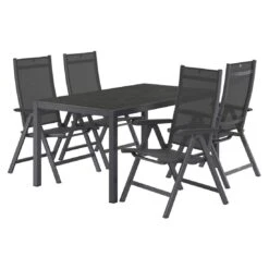 Das Gestell ist aus Aluminium gefertigt. Dadurch lassen sich die Möbel leicht von einem Standort zum nächsten transportieren und sind dennoch sehr stabil. Optisch ansprechend ist die Farbgebung der Gestelle in Anthrazit. Ein weiteres Highlight der Sitzmöbel ist die Bespannung der Sitzflächen mit Textilene. Dieses Material zeichnet sich durch eine hohe Robustheit gegenüber Hitze und Frost aus und ist leicht zu reinigen. Die Platte des im Set enthaltenen Tisches besteht aus Kettalit. Hierbei handelt es sich um Furnierholz, das mit Kunstharz imprägniert ist und zu einer fugenlosen Tischplatte gepresst wird. Dadurch entsteht eine überaus kratzfeste und widerstandsfähige Oberfläche, die eine hohe Abriebfestgkeit aufweist und bruch- sowie schlagfest ist. Darüber hinaus überzeugt Kettalit mit seiner Wetterfestigkeit und UV-Beständigkeit. Der Tisch ist klassisch rechteckig gestaltet. Als klassische Design-Komponente fungiert das geradlinige Vierfußgestell. Während die Farbe des Gestells Anthrazit ist, begeistert die Tischplatte in Schiefer.