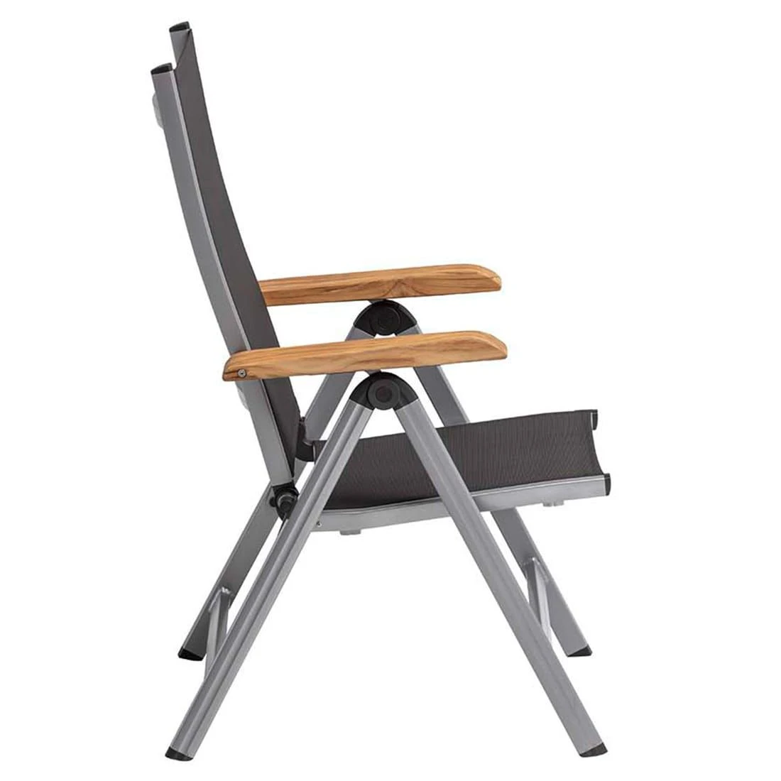 Das Gestell besteht aus pflegeleichtem und wetterfestem Aluminium. Für eine attraktive Optik ist das Gestell im Farbton Silber gehalten. Ein weiteres Highlight des Klappsessels ist die Bespannung mit Textilene. Dieser Bezugsstoff überzeugt durch eine hohe Robustheit gegenüber Hitze und Frost und ist leicht zu reinigen. Die Farbgestaltung der Sitzfläche in Anthrazit ist überaus ansprechend.