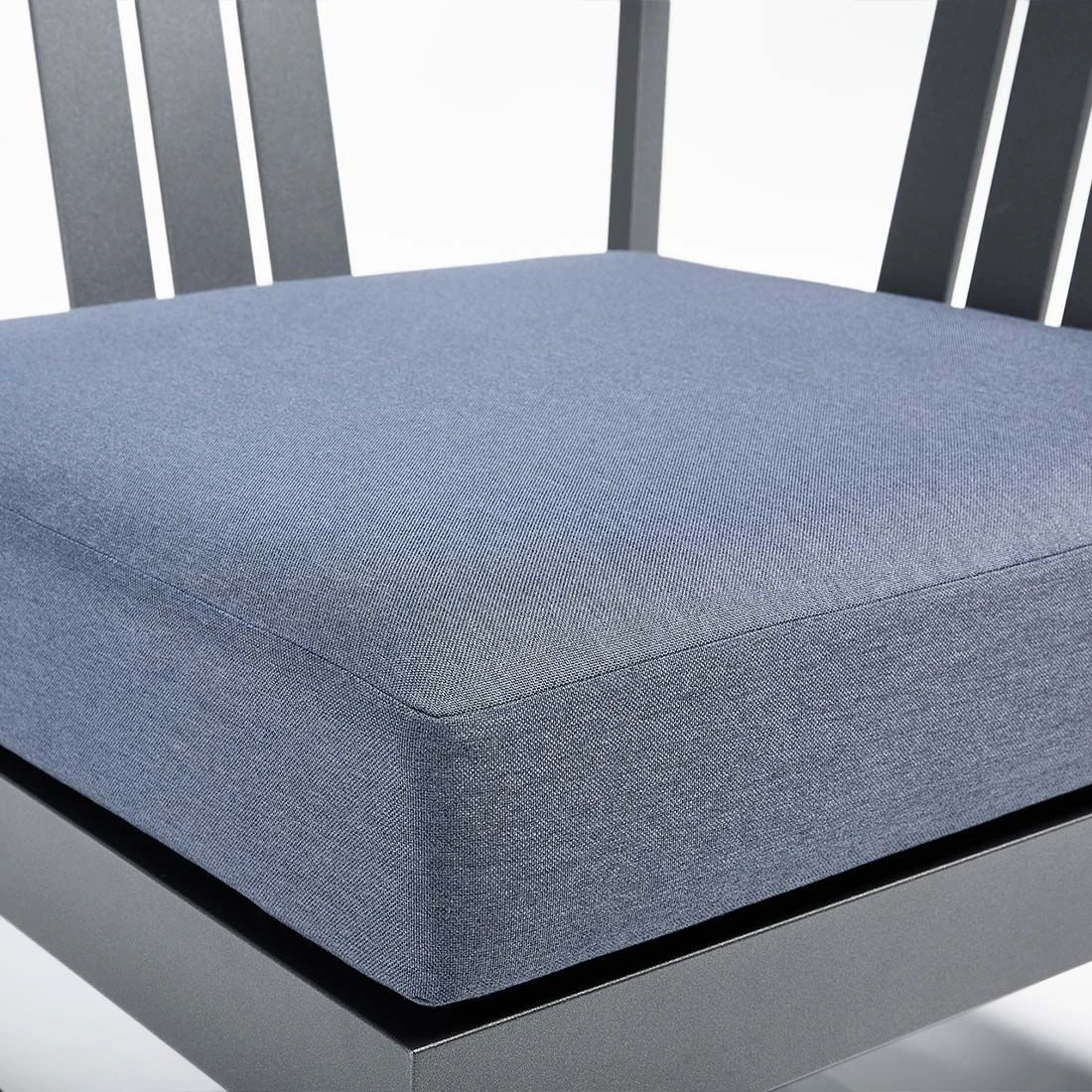 Das Gestell ist aus Aluminium gefertigt. Optisch begeistert das Gestell in der Farbe Anthrazit. Die Sitzfläche ist mit dem innovativen Outdoorstoff Agora bespannt. Agora besteht aus 100% spinndüsengefärbtem Acryl und wurde speziell für den Einsatz im Freien entwickelt. Die Fasern werden zudem komplett durchgefärbt, um ein Höchstmaß an UV- und Farbbeständigkeit zu erzielen. Agora-Stoffe fühlen sich übrigens nicht wie Kunststoff, sondern ähnlich wie Baumwolle an.