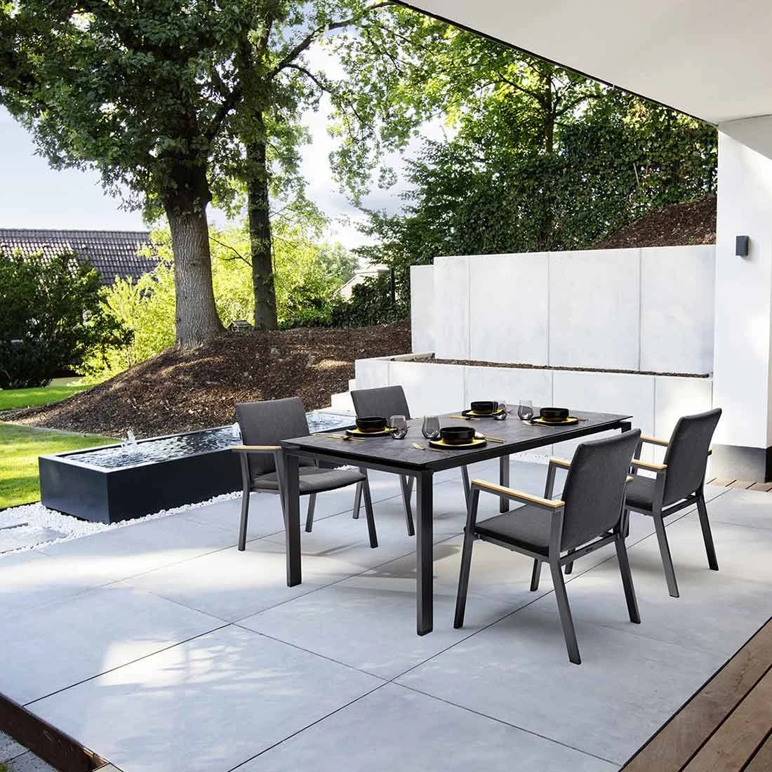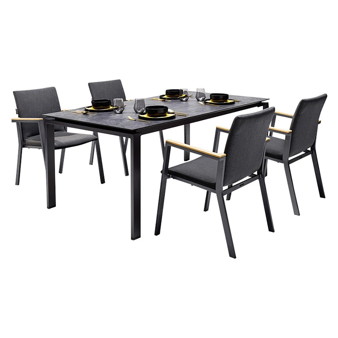 Das Gestell ist aus Aluminium gefertigt. Dadurch lassen sich die Möbel leicht von einem Standort zum nächsten transportieren und sind dennoch sehr stabil. Optisch ansprechend ist die Farbgebung der Gestelle in Anthrazit. Die Farbgebung der Sitzfläche ist Sooty. Im Set enthalten ist zudem ein Tisch. Die formvollendete HPL-Tischplatte ist nicht nur ein optischer Hingucker, sondern besitzt außerdem eine besonders robuste und unbedingt kratzfeste Oberfläche, die jeglichen Belastungen entgegenwirkt. Passend zum Gesamtbild des Gartenmöbel-Sets begeistert die Tischplatte mit ihrer Farbgebung in Jura Anthrazit. Als klassische Design-Komponente fungiert das geradlinige Vierfußgestell. Der Tisch ist klassisch rechteckig gestaltet.