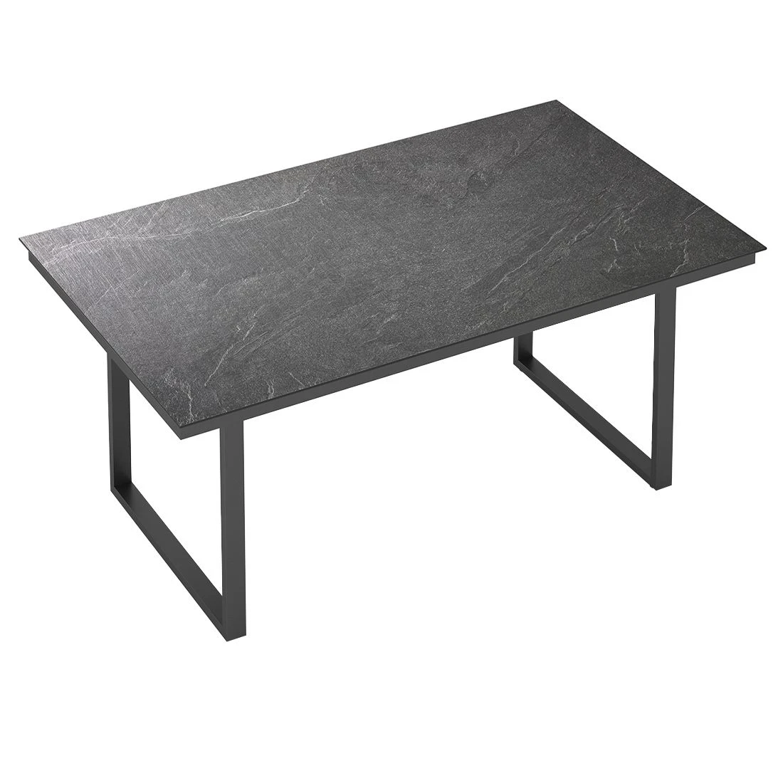 Das Gestell des eleganten Tisches ist aus Aluminium gefertigt. Das robuste Kufengestell lässt sich hervorragend mit modernen Freischwingern und anderen Kufenmöbeln kombinieren. Die schöne HPL-Tischplatte ist nicht nur ein optischer Hingucker, sondern besitzt zudem eine besonders stabile und durchaus kratzfeste Oberfläche, die sämtlichen Belastungen entgegenwirkt. Farblich ist die Platte in Jura Anthrazit gehalten. Der Gartentisch ist klassisch rechteckig gestaltet.