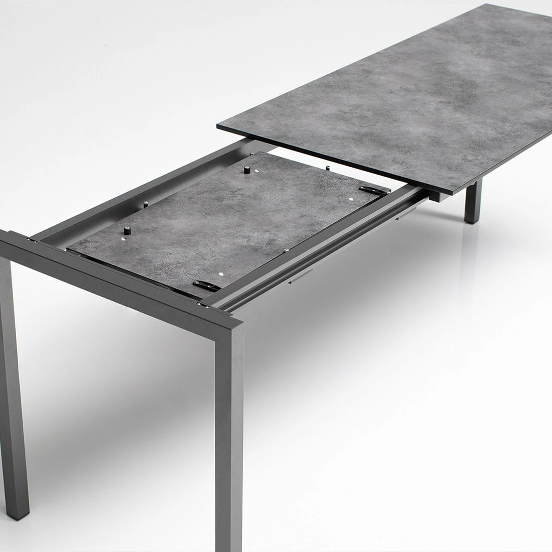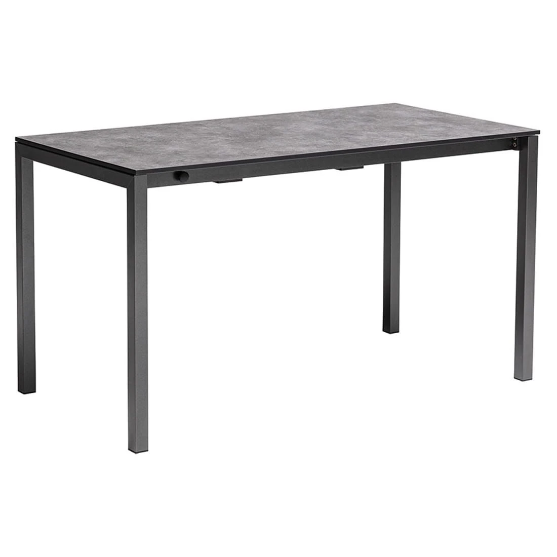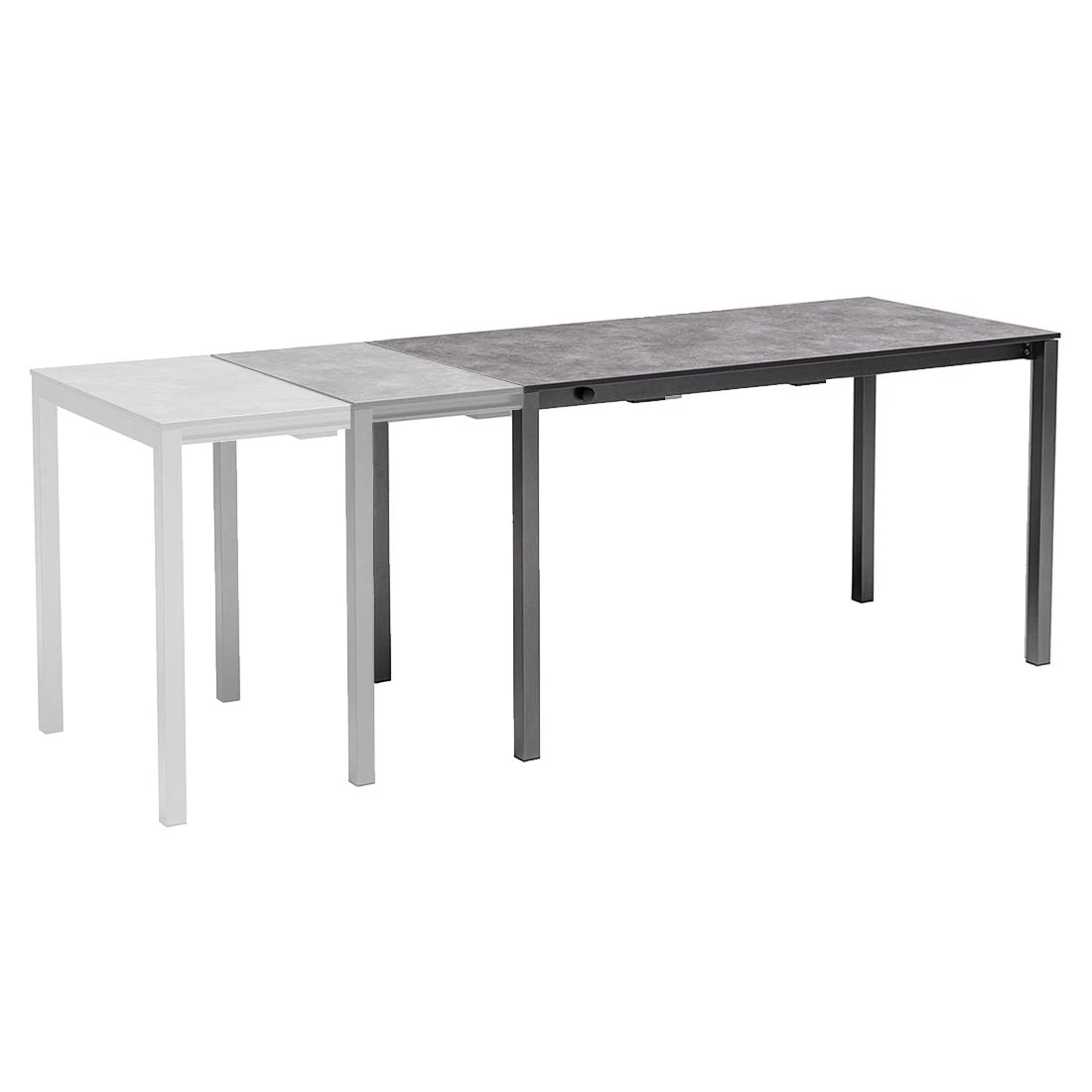 Eine sehr schöne Optik bietet Ihnen die Oberfläche des im Set enthaltenen Tisches aus HPL. Diese in Anthrazit gehaltene Tischplatte ist zusätzlich frostsicher und hitzebeständig bis maximal 180 °C. Klassisch aus vier Tischbeinen besteht das Gestell des Tisches.