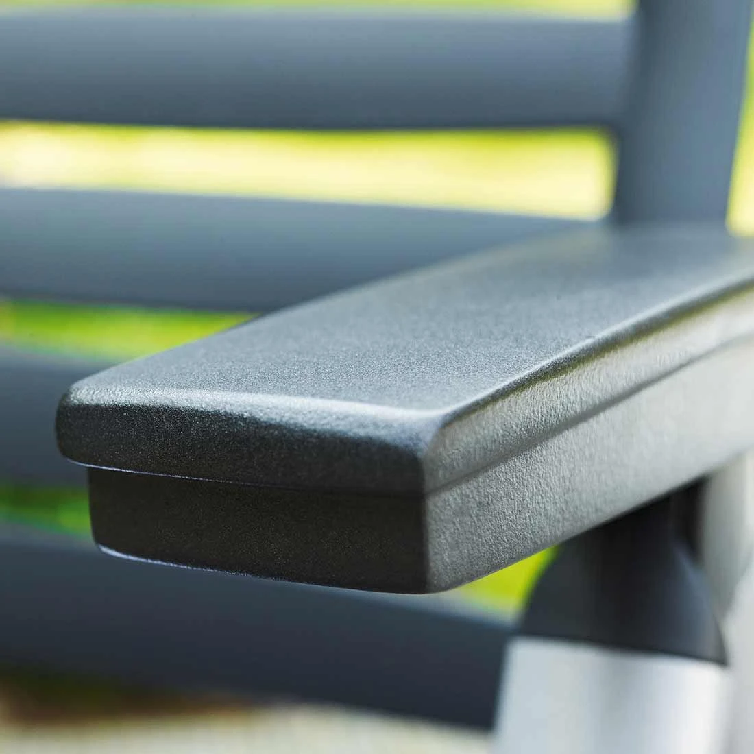 Die robusten Metallgestelle aus Aluminium sind pflegeleicht und garantieren gleichzeitig eine hohe Stabilität. Darüber hinaus gewährleistet dieses leichte Material, dass Sie die Möbel bequem transportieren können. Optisch ansprechend ist die Farbgebung der Gestelle in Silber. Ein weiterer Pluspunkt der Sitzmöbel sind die Kunststoff-Sitzflächen. Kunststoff ist sehr pflegeleicht und verleiht dem Gartenmöbel-Set ein klassisches Aussehen. Die Farbgebung der Sitzfläche ist Anthrazit. Zum Set gehört ein Tisch. Für dessen Tischplatte wird Kettalit verwendet. Dabei handelt es sich um Furnierholz, das mit Kunstharz imprägniert ist und zu einer fugenlosen Tischplatte gepresst wird. Dadurch entsteht eine überaus kratzfeste und widerstandsfähige Oberfläche, die eine hohe Abriebfestgkeit aufweist und bruch- sowie schlagfest ist. Darüber hinaus überzeugt Kettalit mit seiner Wetterfestigkeit und UV-Beständigkeit. Passend zum Gesamtbild des Gartenmöbel-Sets begeistert die Tischplatte mit ihrer Farbgebung in Schiefer.